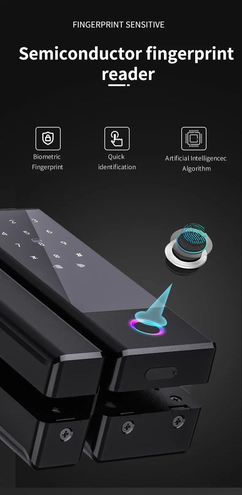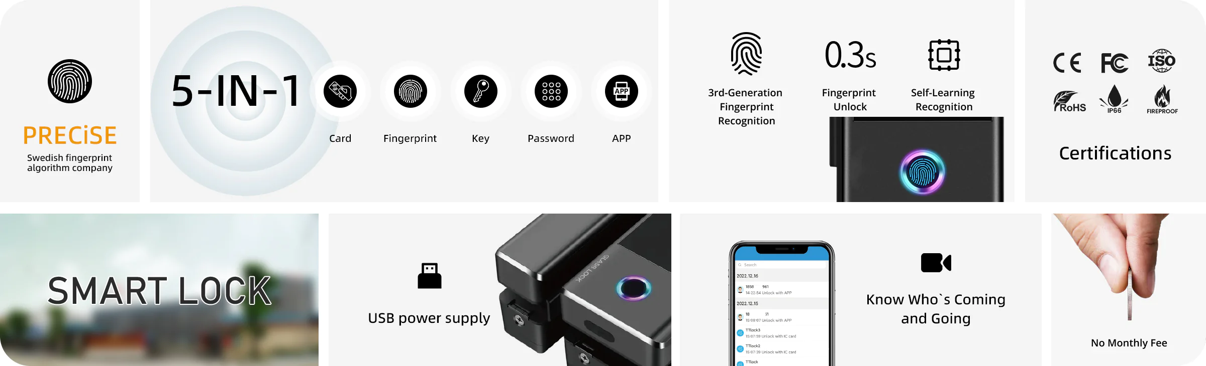 - Zamek można otworzyć bezprzewodowo za pomocą czytnika linii papilarnych, kodu PIN, klucza, karty RFID (13,56 mhz) lub aplikacji mobilnej