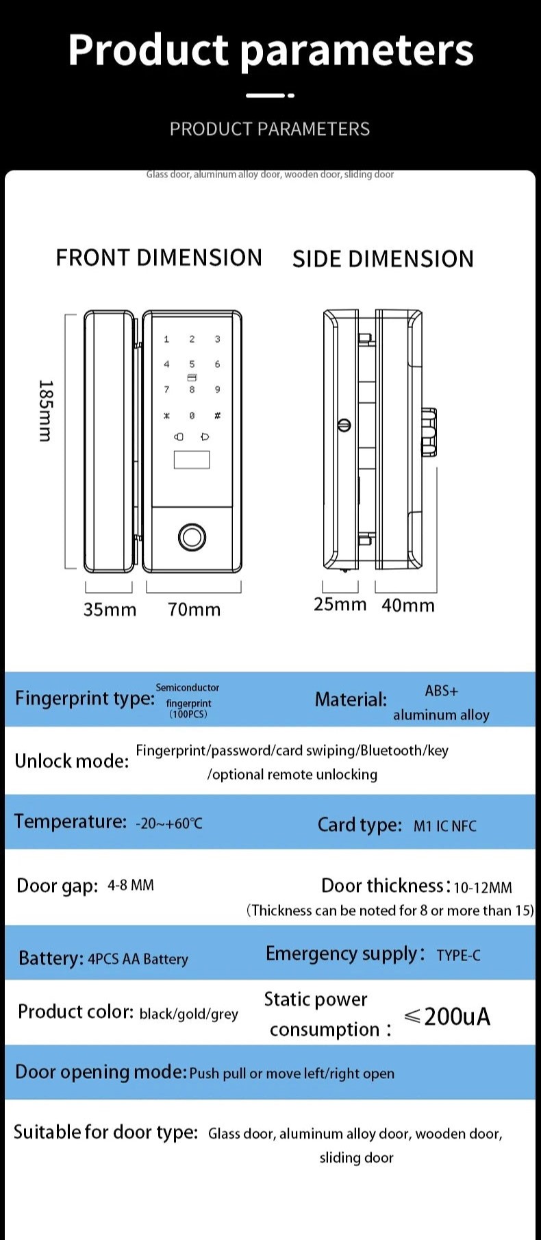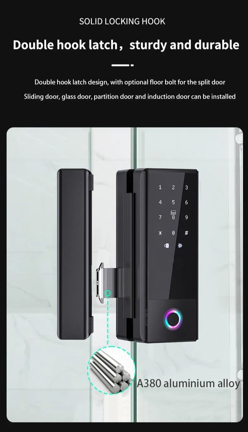 LS-C83- to zamek współpracujący z systemami smart TUYA i TTlock. Zamek umożliwia odblokowanie za pośrednictwem kodu, karty, odcisku palca, aplikacji mobilnej, klucza fizycznego i bluetooth. LC-C81 ma wbudowany moduł bluetooth 4.1ble. Wykonany jest z wysokiej klasy stopów aluminium i ABS. Zamek dedykowany do montażu na drzwiach szklanych.