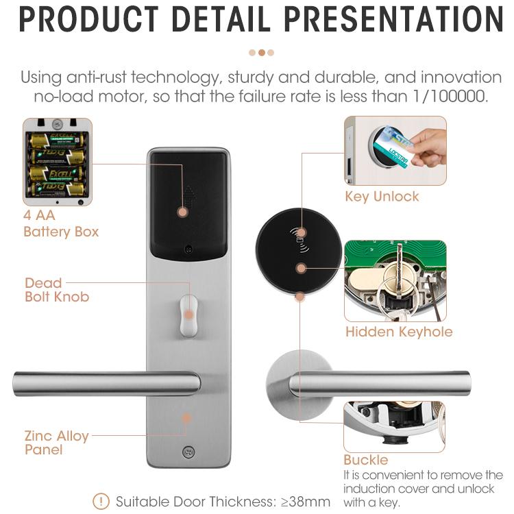 Zamek hotelowy LCOSTAR (LS-8202), można odblokować za pomocą karty i klucza mechanicznego. Obsługuje różne stopnie autoryzacji, takie jak karta budynku, karta piętra, karta pokojówki, karta konserwatora, karta recepcji i tak dalej. Dostarczamy również pełny zestaw akcesoriów.