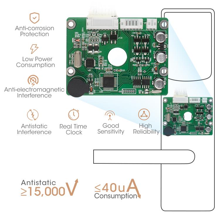 - Różne stopnie autoryzacji: obsługa 14 typów kart, w tym karta do ustawiania numeru pokoju, karta główna, karta awaryjna, karta piętra, karta budynku, karta gościa, karta tymczasowa, karta alarmowa, karta nie przeszkadzać itp.