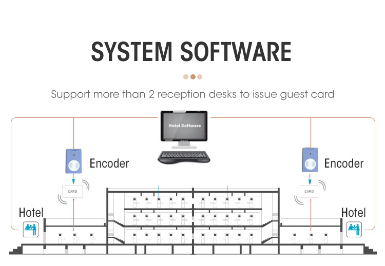 - System zamknięć hotelowych obejmuje: oprogramowanie zamykające hotel, koder, kartę RF, przełącznik oszczędzania energii, moduł zbierający dane