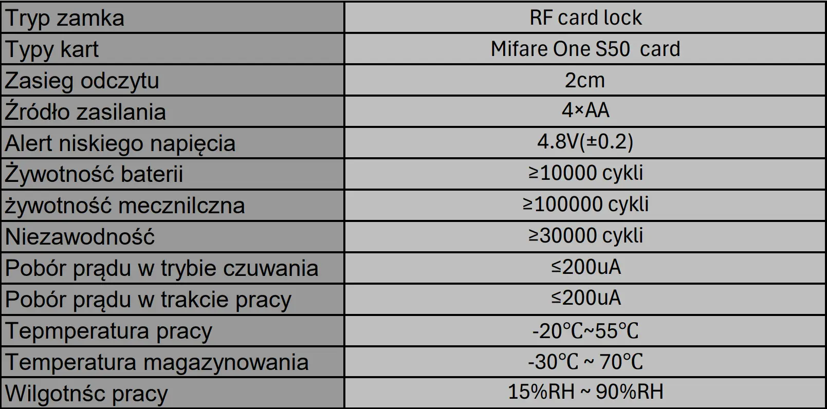 Sposoby otwarcia: | Karta RFID + klucz mechaniczny |