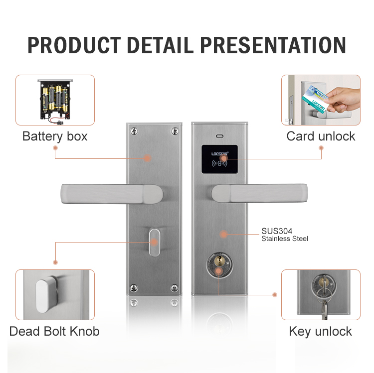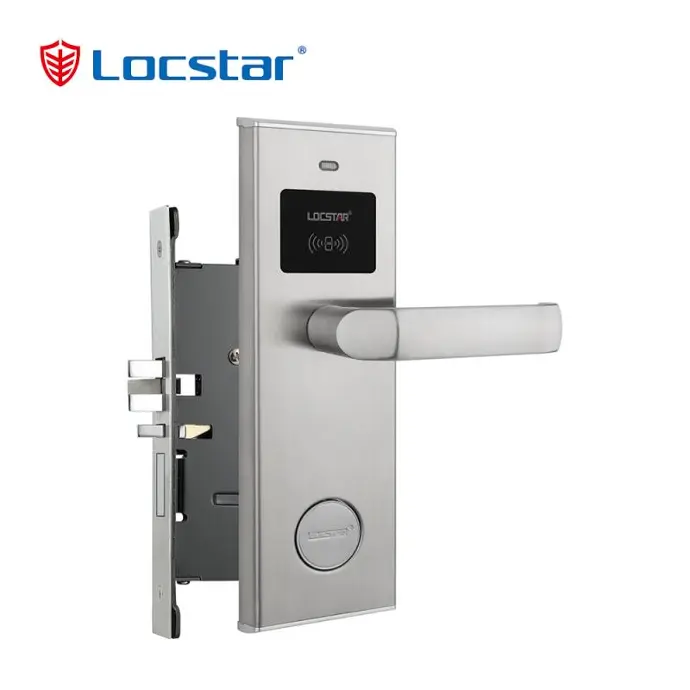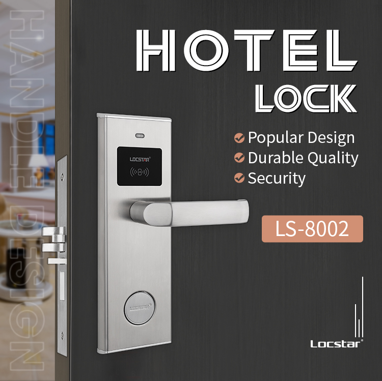 Zamek LS-8002 to niedrogi, ale wydajny, klasyczny zamek hotelowy ze stali nierdzewnej. LS-8002 Odblokowuje się za pomocą karty RFID i klucza mechanicznego w sytuacjach awaryjnych.