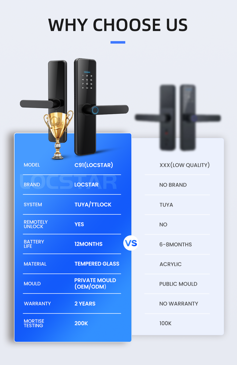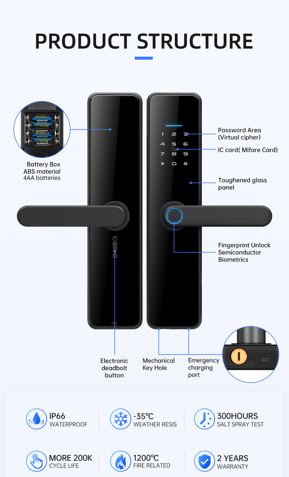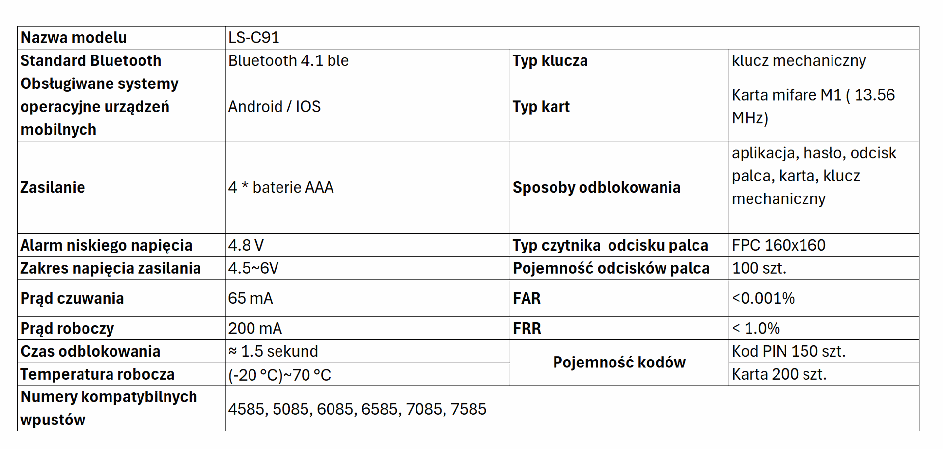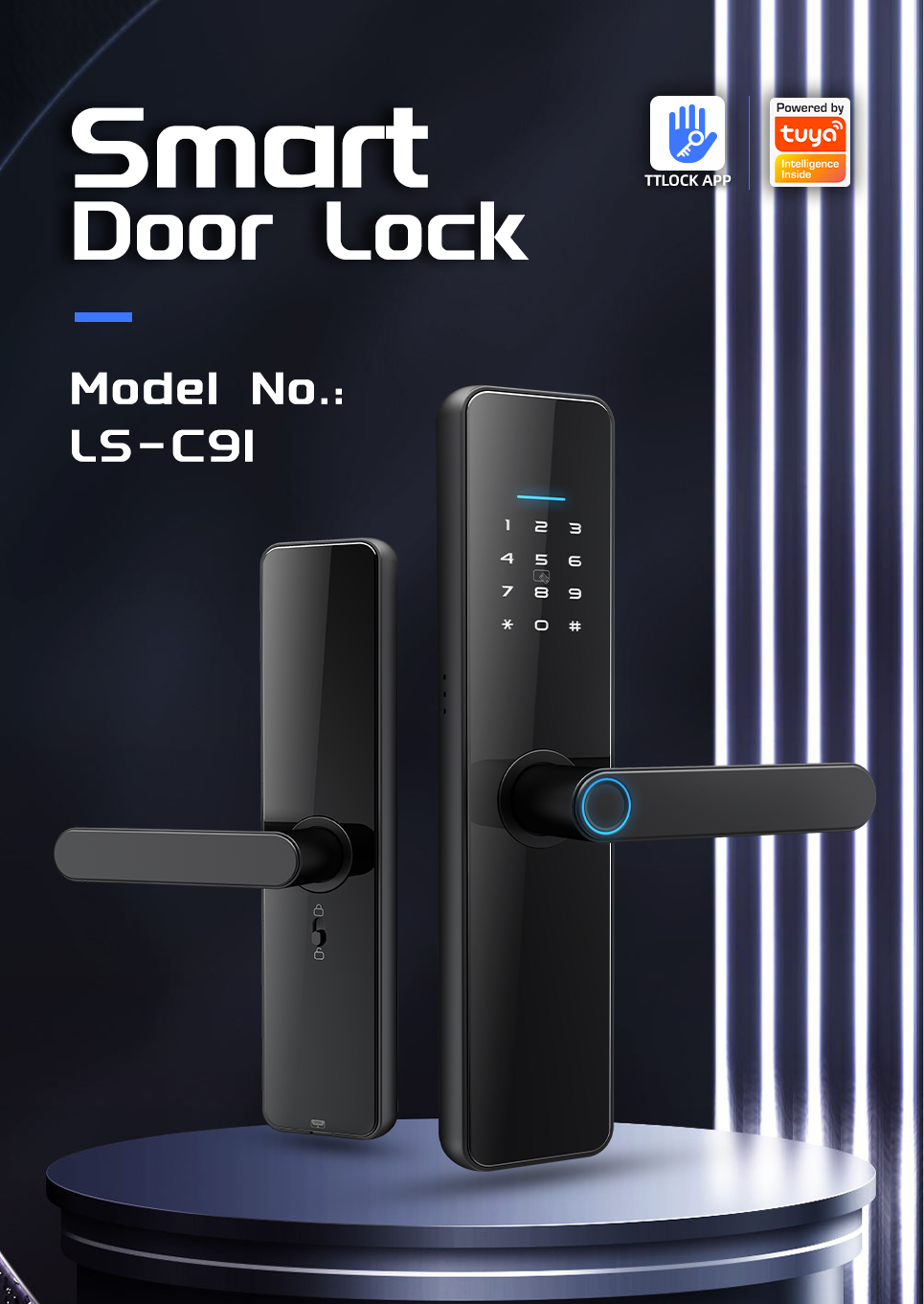 LS-C91 to zamek współpracujący z systemami smart TUYA i TTlock. Zamek umożliwia odblokowanie za pośrednictwem kodu, karty, odcisku palca, aplikacji mobilnej i klucza fizycznego. LC-C91 ma wbudowany moduł bluetooth 4.1ble. Wykonany jest z wysokiej klasy stopu aluminium i akrylu.