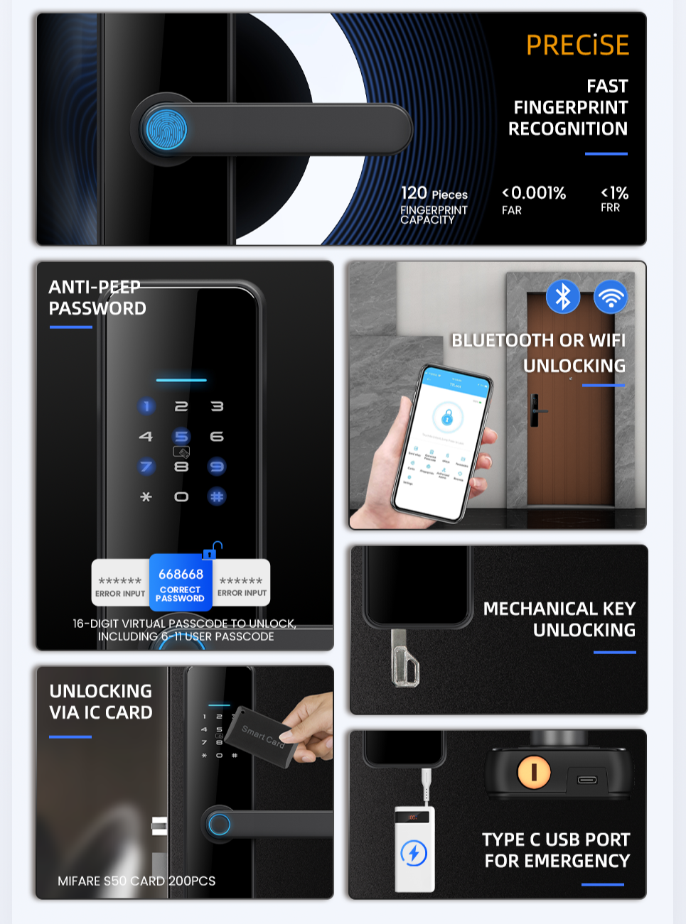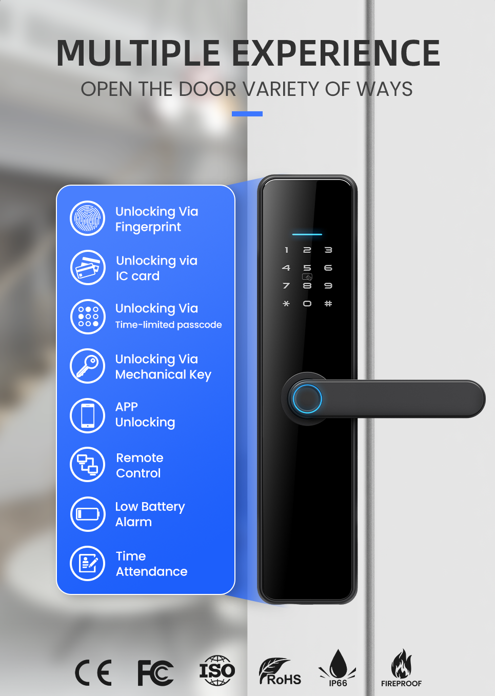 - Zamek można otworzyć bezprzewodowo za pomocą rozpoznawania linii papilarnych, kodu PIN, klucza lub karty 13,56 MHz