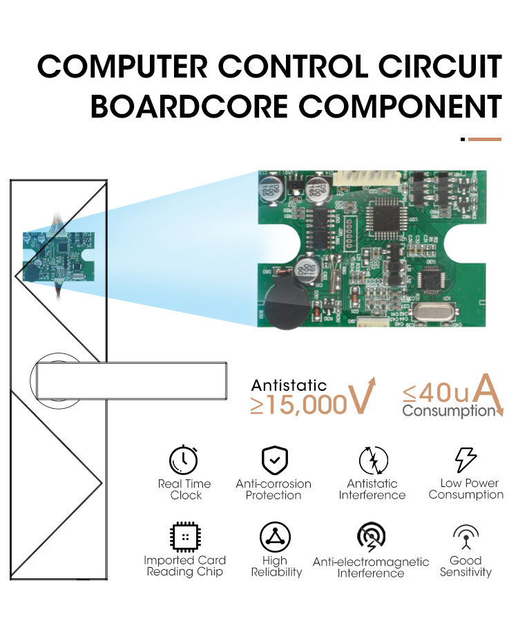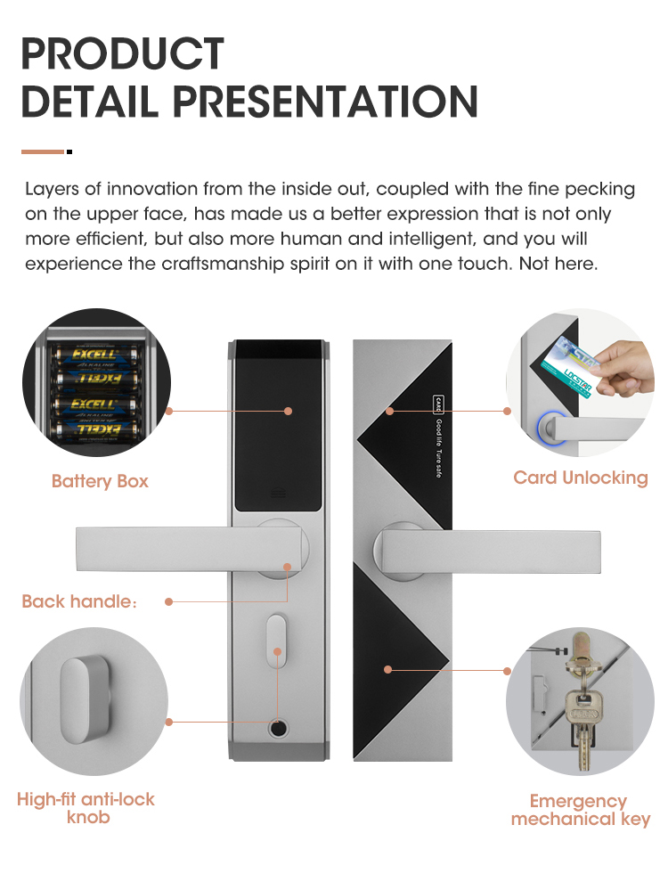 - Różne stopnie autoryzacji: obsługa 14 typów kart, w tym karta do ustawiania numeru pokoju, karta główna, karta awaryjna, karta piętra, karta budynku, karta gościa, karta tymczasowa, karta alarmowa, karta nie przeszkadzać itp.