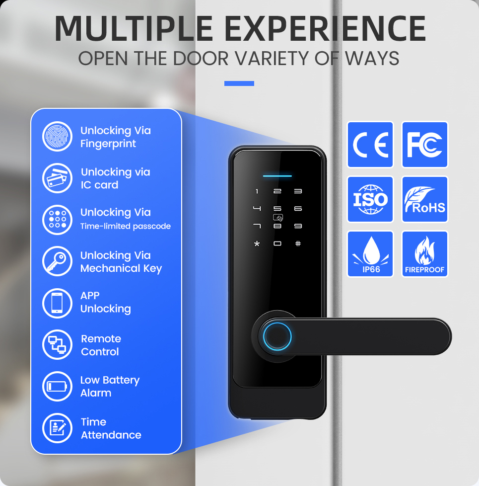 - Bezprzewodowe odblokowanie za pomocą odcisku palca, kodu PIN, klucza, karty RFID (13,56 MHz) lub aplikacji mobilnej